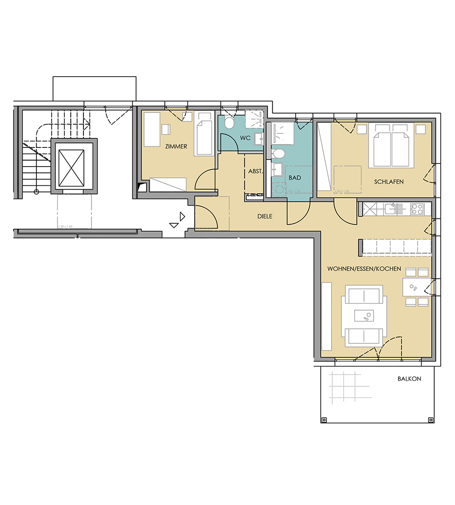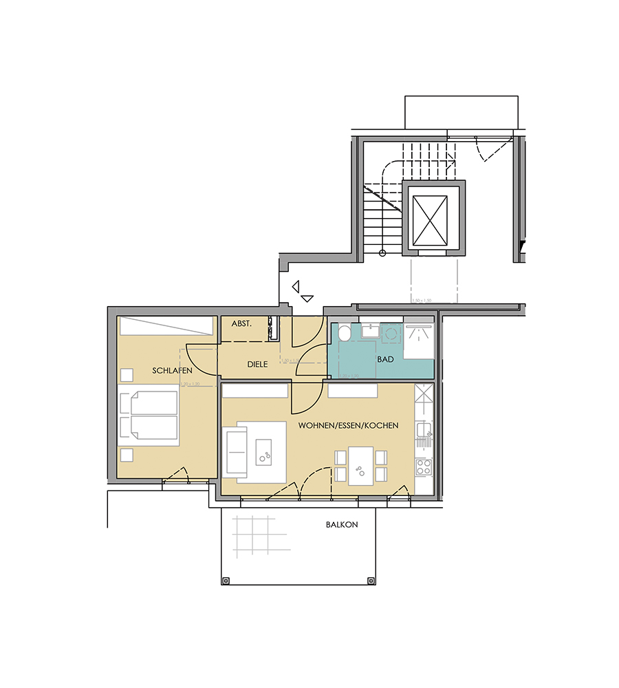 offene Küche, Bad, Gäste-WC (optional mit Dusche), Abstellbereich, Balkon